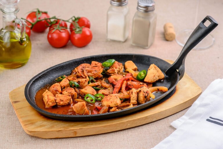 Ceapă – 120g, Ardei dulce – 120g, Piept de pui – 120g, Ardei iute – 25g, Ulei de floarea soarelui – 15ml