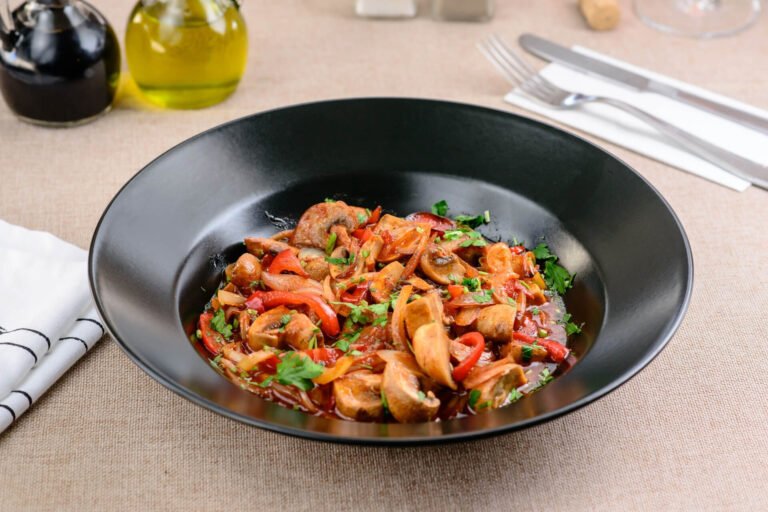 Ciuperci champignons – 200g, Ardei – 100g, Ceapă – 100g, Ulei de floarea soarelui – 20ml, Sare 2g, Piper 1g